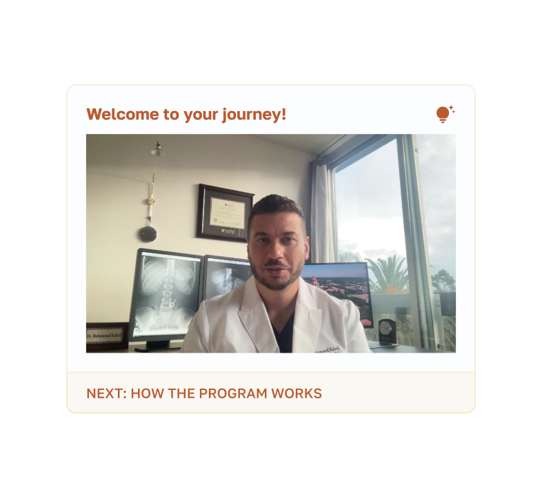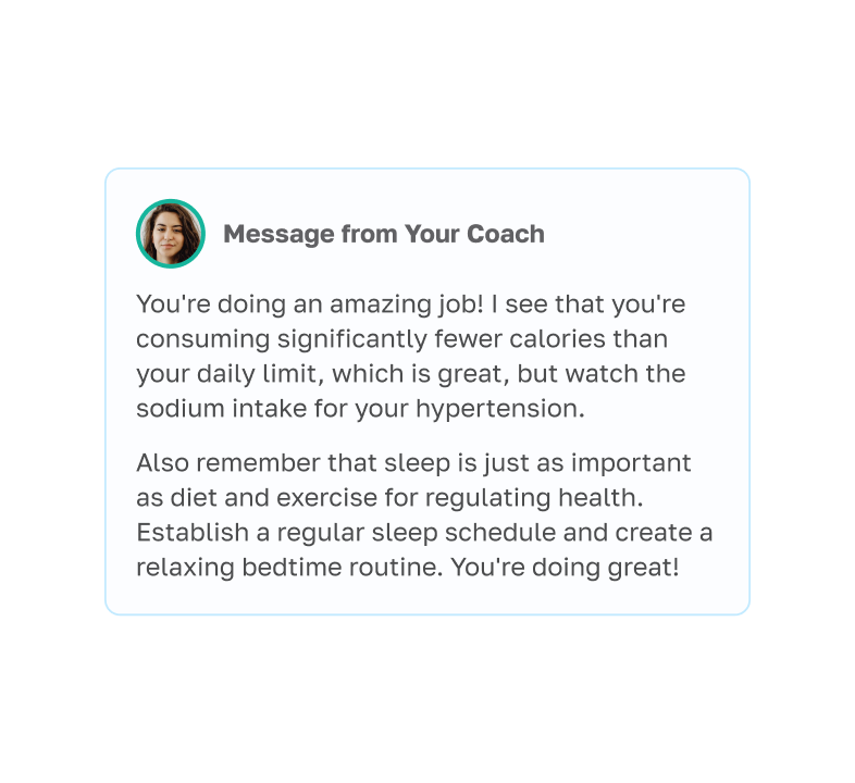 A dedicated health coach guides your customized health plan. Our AI-powered app helps track activity easily, provides insight, and lets you interact with our team of clinicians.